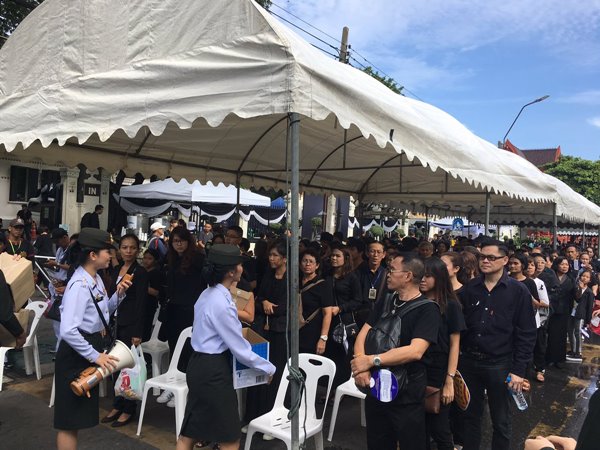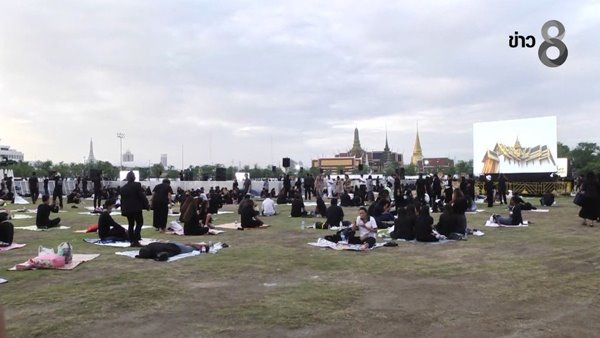 กระทั่งเวลา 13.00 น. ประชาชนชาวไทยต่างเปล่งเสียงร้องเพลงสรรเสริญพระบารมีดังกึกก้องไปทั่วทั้งท้องสนามหลวง โดยมีการถ่ายทอดสดผ่านโทรทัศน์รวมการเฉพาะกิจแห่งประเทศไทย (ทรท.) แม้จะต้องร้องท่ามกลางสภาพอากาศที่ร้อนอบอ้าว แต่ทุกคนก็ไม่ยอมแพ้ยังคงยืนร้องเพลงเพื่อถวายความอาลัยแด่ในหลวง รัชกาลที่ 9