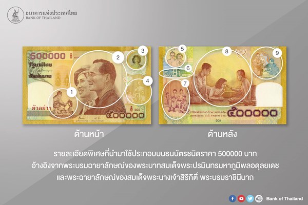 วันที่ 26 ตุลาคม 2559 เพจ Bank of Thailand ของธนาคารแห่งประเทศไทย ได้เผยแพร่ภาพและข้อมูลของธนบัตรที่ระลึก ชนิดราคา 500,000 บาท ธนบัตรไทยที่มีชนิดราคาสูงที่สุด ซึ่งทางธนาคารแห่งประเทศไทยได้จัดพิมพ์เมื่อปี 2543 เพื่อเฉลิมพระเกียรติ เนื่องในอภิลักขิตสมัยมหามงคล วันราชาภิเษกสมรส และวันบรมราชาภิเษก ครบ 50 ปี โดยมีชนิดราคา 500,000 บาท และ 50 บาท