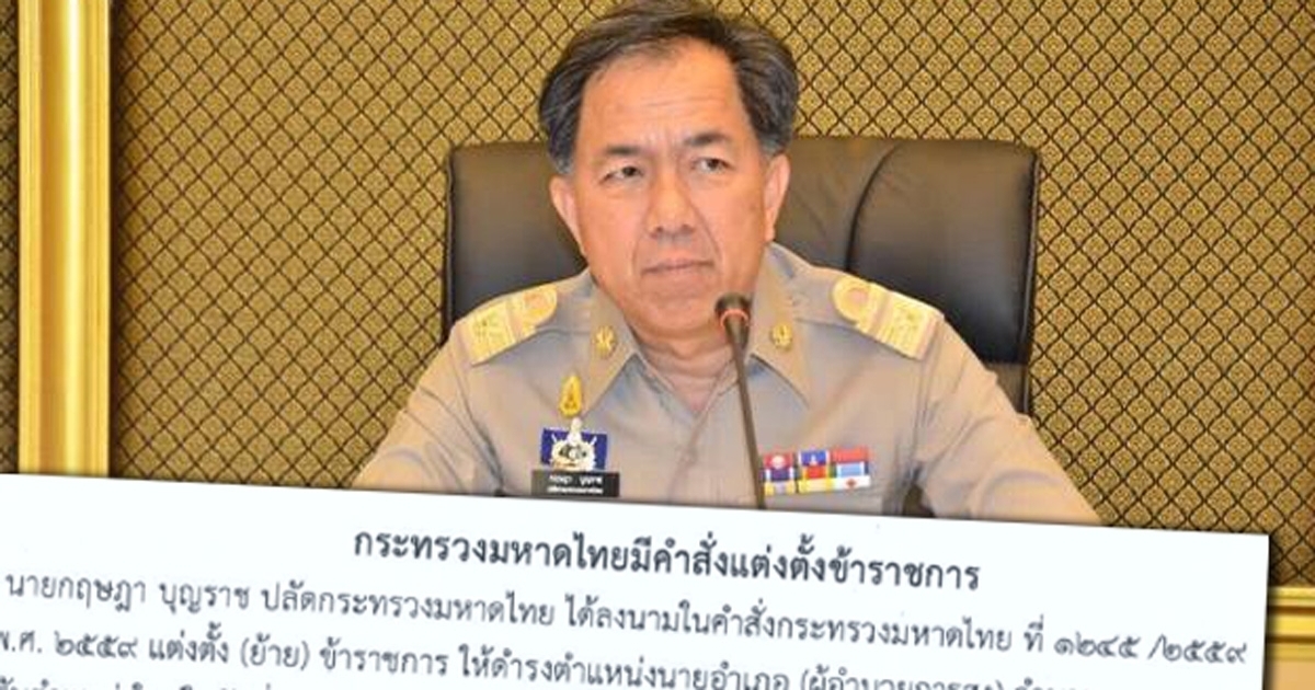 วันที่ 2 พฤศจิกายน 2559 ผู้สื่อข่าวรายงานว่า นายกฤษฎา บุญราช ปลัดกระทรวงมหาดไทย ได้ลงนามคำสั่งกระทรวงมหาดไทย เมื่อวันที่ 31 ตุลาคม แต่งตั้ง (ย้าย) ข้าราชการให้ดำรงตำแหน่งนายอำเภอจำนวน 193 ราย โดยกำหนดให้ไปดำรงตำแหน่งวันที่ 7 พฤศจิกายนนี้