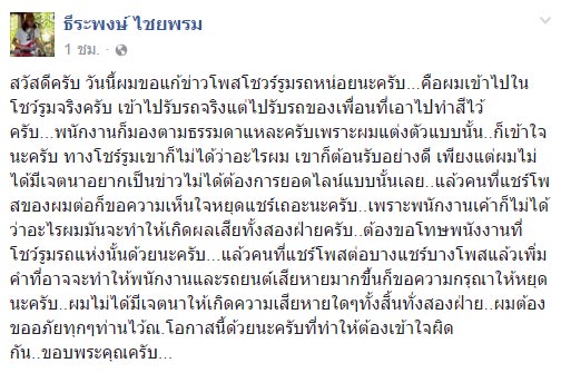อย่างไรก็ตาม ล่าสุดผู้ใช้เฟซบุ๊ก ธีระพงษ์ ไชยพรม ซึ่งเป็นบุคคลที่ถูกอ้างถึงข้างต้นก็ได้ออกมาชี้แจงถึงสิ่งที่เกิดขึ้น โดยระบุว่าตนไปรับรถของเพื่อนที่ส่งไปทำสี ซึ่งจริง ๆ แล้วพนักงานก็มองตามธรรมดา และทางโชว์รูมก็ต้อนรับอย่างดี ทั้งนี้จึงอยากขอวอนชาวเน็ตหยุดแชร์เรื่องที่ผ่านการแต่งเติมออกไป เพราะจะเกิดผลเสียต่อทั้งสองฝ่าย เขาต้องขอโทษพนักงานที่โชว์รูมดังกล่าวและทุก ๆ ฝ่ายด้วย ที่ก่อให้เกิดความเข้าใจผิด