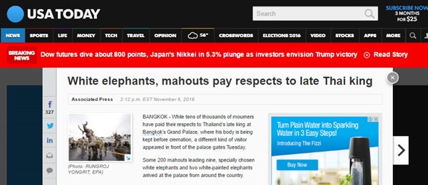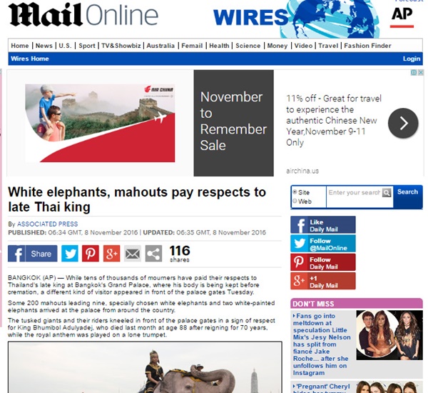 สื่อนอกเสนอข่าว ช้างงางาม 11 เชือก ทำพิธีถวายบังคมพระบรมศพ พระบาทสมเด็จพระปรมินทรมหาภูมิพลอดุลยเดช หน้าพระบรมมหาราชวัง