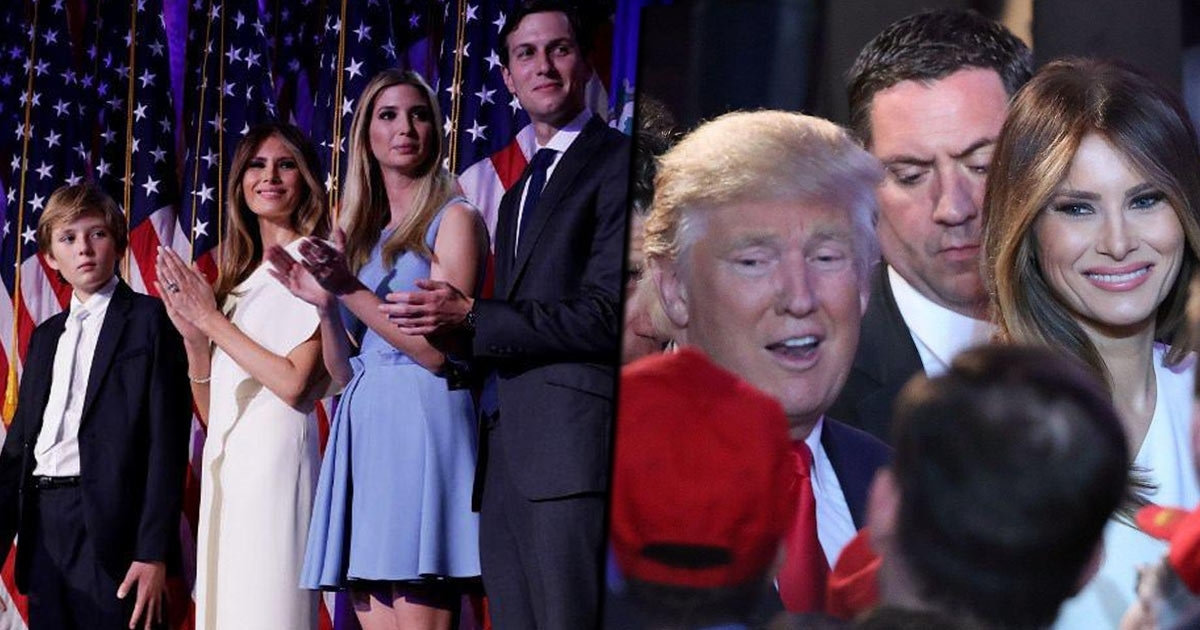 ในการกล่าวสุนทรพจน์ประกาศชัยชนะเลือกตั้งประธานาธิบดีนั้น โดนัลด์ ทรัมป์ ได้พาครอบครัวของเขาขึ้นไปบนเวที อันประกอบด้วย เมลาเนีย ทรัมป์ ภรรยา, อิวานก้า ทรัมป์ และจาเร็ด คุชเนอร์ ลูกสาวและลูกเขย, ทิฟฟานี่ ทรัมป์ ลูกสาว, โดนัลด์ ทรัมป์ จูเนียร์ และวาเนสซ่า ทรัมป์ ลูกชายคนโตและลูกสะใภ้, ไค ทรัมป์ หลานสาว, อีริค ทรัมป์ และ ลาร่า ยูนาสก้า ลูกชายและลูกสะใภ้ และ บาร์รอน ทรัมป์ ลูกชายคนสุดท้อง
