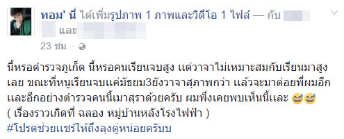เมื่อวันที่ 16 พฤศจิกายน 2559 เฟซบุ๊ก ทอม' นี่ ได้มีการโพสต์คลิปเหตุการณ์ของชายกลางคน ซึ่งอ้างว่าเป็นเจ้าหน้าที่ตำรวจ บังคับให้ไหว้ขอโทษ เนื่องจากรถส่งของจอดขวางทาง