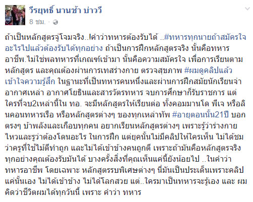 บ่าววี นักร้องชื่อดัง โพสต์ปมคลิปฟาดหลังทหาร ชี้ ถ้าเป็นหลักสูตรจู่โจมจริง ยังไงก็ต้องรับได้ แถมสิ่งที่เห็นในคลิป ยังถือว่าน้อยไปด้วย