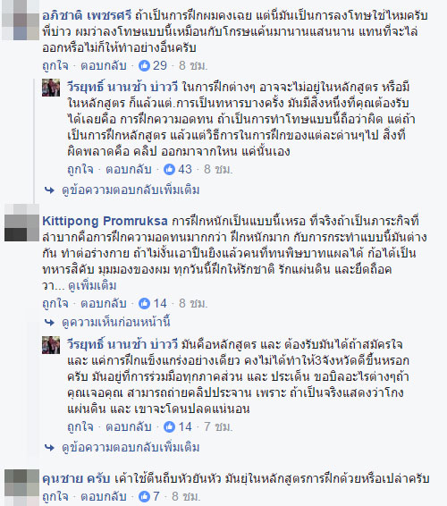 เมื่อวันที่ 19 พฤศจิกายน 2559 เฟซบุ๊ก วีรยุทธิ์ นานช้า บ่าววี หรือ บ่าววี นักร้องชื่อดัง มีการโพสต์ถึงกระแสข่าวคลิปฟาดหลังทหารที่กำลังตกเป็นข่าวอยู่ในขณะนี้ว่า ถ้าคลิปนี้เป็นหลักสูตรจู่โจมจริง ก็ถือว่าทหารต้องรับได้ และบางครั้งในการฝึก สิ่งที่เห็นในคลิปยังน้อยไป ซึ่งทหารจะรู้กันเอง สิ่งที่ผิดพลาดเพียงอย่างเดียวคือ คลิปหลุดมาได้อย่างไร