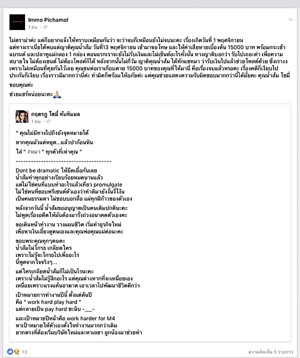 เมื่อวันที่ 19 พฤศจิกายน 2559 เฟซบุ๊ก Red Skull V.SE ได้มีการโพสต์ภาพ ข้อความจากเฟซบุ๊ก Immo Pichamol ซึ่งระบุว่าเป็นญาติของคู่กรณีของกฤตรฎ ทับทิมผล หรือน้ำส้ม โซมี่ พริตตี้สาวที่ขับรถชนบนถนนรัชดาภิเษกกว่า 9 คัน มีข้อความระบุไว้ดังนี้