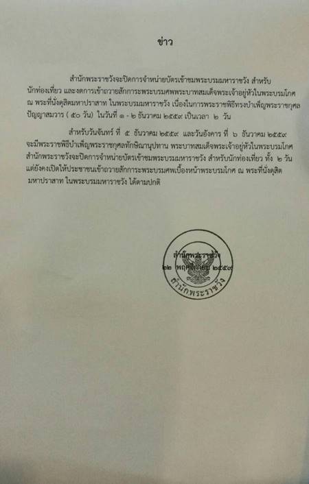 เมื่อวันที่ 22 พฤศจิกายน 2559 สำนักพระราชวัง ระบุว่า ในวันที่ 1-2 ธันวาคม 2559 จะมีการปิดจำหน่ายบัตรเข้าชมพระบรมมหาราชวัง สำหรับนักท่องเที่ยว และงดเข้าถวายสักการะพระบรมศพ พระบาทสมเด็จพระปรมินทรมหาภูมิพลอดุลยเดช ที่พระที่นั่งดุสิตมหาปราสาท เนื่องจากมีพระราชพิธี ทรงบำเพ็ญพระราชกุศล ปัญญาสมวาร (50 วัน)