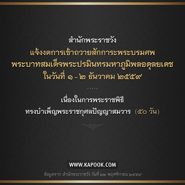 สำนักพระราชวัง แจ้งงดถวายสักการะพระบรมศพ 1-2 ธันวาคมนี้ เนื่องในพระราชพิธี ทรงบำเพ็ญพระราชกุศล ปัญญาสมวาร ขณะที่วันที่ 5-6 ธันวาคม ยังคงเปิดให้ถวายสักการะพระบรมศพ
