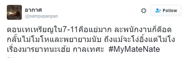 โดยชาวเน็ตต่างพากันวิพากษ์วิจารณ์การกระทำดังกล่าวอย่างหนักหน่วง พร้อมกับติดแฮชแท็ก #MyMateNate อาทิ บัญชีทวิตเตอร์ @buaNite ได้ระบุว่า "แค่นี้ก็สรุปได้ว่าคนนี้เป็นคนยังไง เพราะสะท้อนจิตสำนึกที่ไร้มารยาท ไม่ให้เกียรติคนอื่น และดูถูกคนที่ไม่รู้ภาษาอังกฤษได้ชัดเจน #MyMateNate" - รีทวีตต่อกันมากถึง 2.7 ครั้ง
