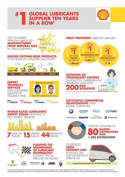 น้ำมันหล่อลื่นเชลล์ยังเป็นผู้นำตลาดน้ำมันหล่อลื่นสำหรับรถยนต์โดยสารในประเทศสหรัฐอเมริกา (22%) ฟิลิปปินส์ (32%) มาเลเซีย (31%) แคนาดา (19%) และสาธารณรัฐประชาชนจีน (14%) โดยมีเทคโนโลยีใหม่ในการผลิตน้ำมันเชื้อเพลิงจากก๊าซธรรมชาติ (GTL) ที่นำมาใช้พัฒนากระบวนการผลิตน้ำมันหล่อลื่นเกรดพรีเมียม และเป็นหนึ่งในองค์ประกอบหลักในการขับเคลื่อนสู่ความสำเร็จ โดย เชลล์ เฮลิกส์ อัลตร้า ที่มาพร้อมเพียวพลัส เทคโนโลยี เปิดตัวในปี 2557 ได้เติบโตขึ้นด้วยเลขสองหลัก และวางจำหน่ายแล้วในกว่า 100 ประเทศทั่วโลก นอกจากนี้ ส่วนแบ่งการตลาดพรีเมียมของน้ำมันหล่อลื่นเพ็นซอยล์ รุ่นแพลตตินัม ของเชลล์ ได้เพิ่มขึ้น 155% ในทวีปอเมริกาเหนือ ตั้งแต่ปี 2555 โดยได้แรงหนุนจากเชลล์ เพียวพลัส เทคโนโลยี ซึ่งผลิตภัณฑ์ทั้งหมดนี้ช่วยยกระดับสมรรถนะการขับขี่ในวงการมอเตอร์สปอร์ตทั่วโลกให้ทะลุขีดจำกัดเดิม ๆ
