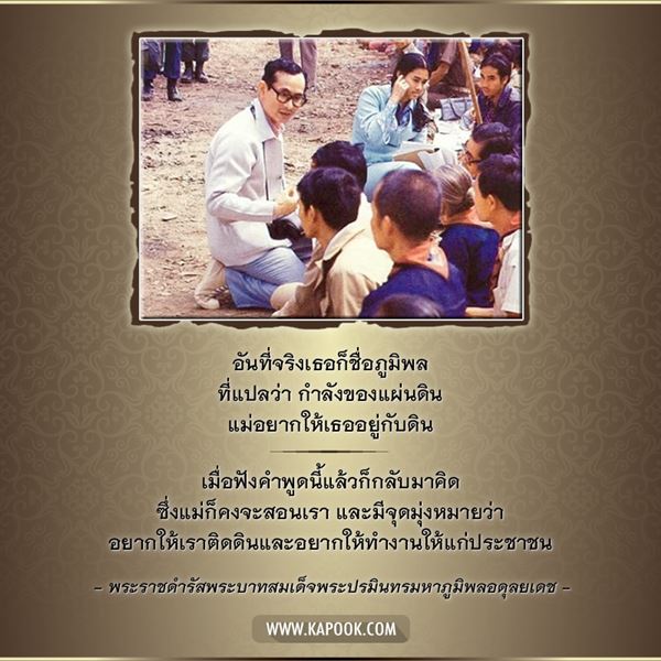 "อันที่จริงเราชื่อ "ภูมิพล" ที่แปลว่า "กำลังของแผ่นดิน" แม่ก็อยากให้เธออยู่กับดิน เมื่อฟังคำพูดแล้วกลับมาคิด ซึ่งแม่คงจะสอนเราและมีจุดมุ่งหมายว่าอยากให้ติดดินและอยากให้ทำงานให้แก่ประชาชน"...พระราชดำรัสของพระบาทสมเด็จพระบรมชนกาธิเบศร มหาภูมิพลอดุลยเดชมหาราช บรมนาถบพิตร