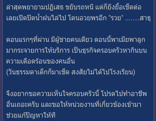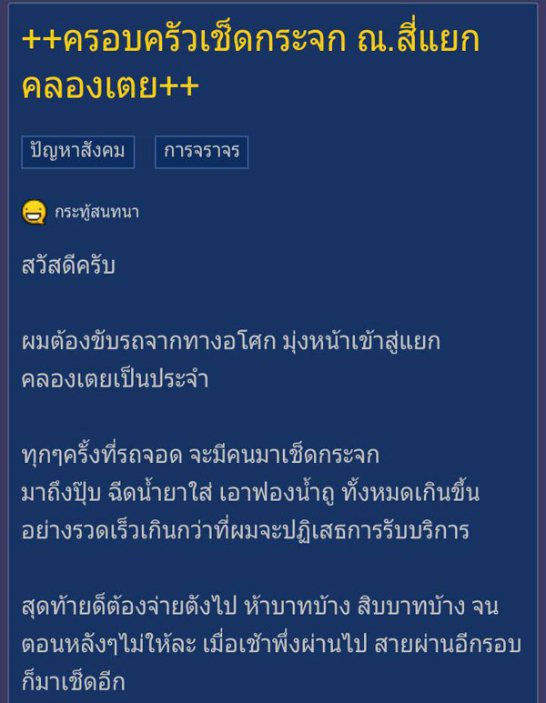เมื่อวันที่ 7 ธันวาคม 2559 ในโลกโซเชียลเน็ตเวิร์กต่างมีการแชร์กระทู้ของคุณ CATtheRAIN สมาชิกเว็บไซต์พันทิปดอทคอม ซึ่งได้ตั้งกระทู้ว่า ครอบครัวเช็ดกระจก ณ.สี่แยกคลองเตย