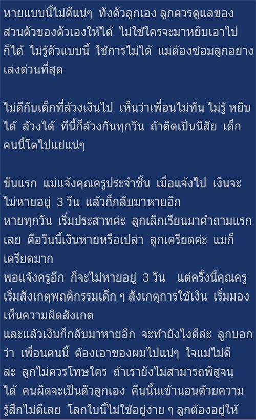 เรื่องกลุ้มใจของหัวอกคนเป็นแม่คงไม่พ้นเรื่องลูก โดยเฉพาะเมื่อรู้ว่าลูกมีปัญหาที่โรงเรียน ทั้งเรื่องการทะเลาะวิวาท ถูกเพื่อนแกล้ง รวมไปถึงการลักเล็กขโมยน้อย ซึ่งล่าสุด (11 ธันวาคม 2559) คุณเธอ สมาชิกเว็บไซต์พันทิปดอทคอม ได้ตั้งกระทู้แชร์ประสบการณ์ว่า "เมื่อลูกชายแม่ ถูกล้วงกระเป๋าทุก ๆ วัน ไม่ทันคน ไม่ทันคิด และคิดไม่ทัน" โดยคุณแม่ท่านนี้ ได้เล่าปัญหาว่า ลูกชายของตนเรียนอยู่ระดับชั้น ป.4 และเป็นเด็กหัวอ่อน สมาธิสั้น มักจะเงินหายที่โรงเรียนเป็นประจำแม้ตนเองจะมัดเงินแน่นหนาแล้วก็ตาม จนสงสัยว่าลูกชายอาจถูกขโมยเงิน บางครั้งขนาดมัดเงินให้เป็นอย่างดี เงินก็ยังหายไปได้ โดยที่เด็กเองก็ไม่แน่ใจว่าเงินหายได้อย่างไร