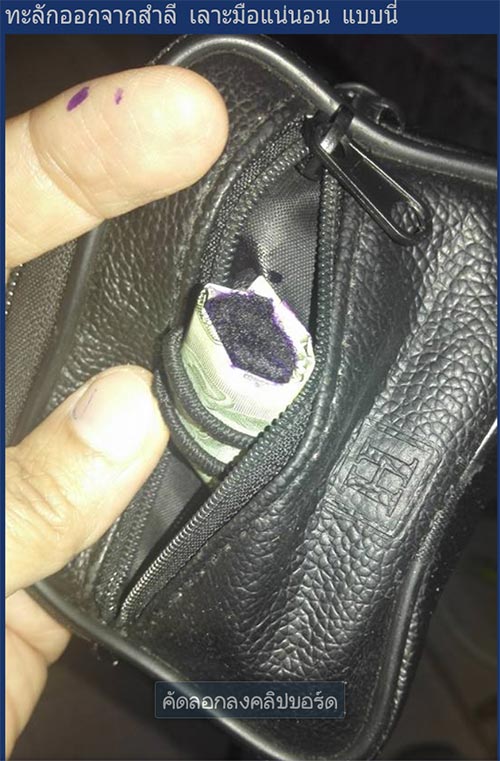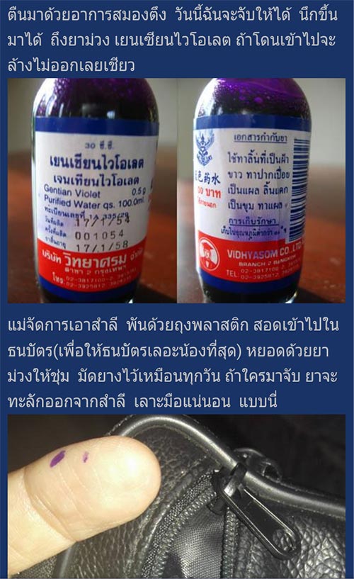 คุณแม่ เล่าต่อว่า ตนจึงปิ๊งไอเดียจับขโมยด้วยการนำสำลีมาชุบ เยนเซียนไวโอเลต แล้วสอดไว้กับธนบัตรของลูก เวลามีคนมาขโมยเงิน มือจะเปื้อนยาเป็นสีม่วงและล้างออกยากมาก เมื่อถึงช่วงพักกลางวันตนจึงไปหาลูกที่โรงเรียนและพบว่าเพื่อนของลูกคนหนึ่งมือเลอะคราบสีม่วง ซึ่งเป็นเด็กที่ลูกชายและครูสงสัยว่าขโมยเงินไป ตนจึงเดินเขามาไปสอบถาม แต่เด็กคนดังกล่าวเฉไฉว่าเห็นรุ่นพี่ ป.6 เป็นคนนำขโมยเงิน ตนจึงนำเรื่องดังกล่าวไปปรึกษากับคุณครู และทำให้ทราบว่า คุณครูเองก็สงสัยเด็กคนนี้เช่นกัน