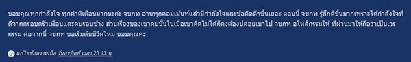 อย่างไรก็ดี เจ้าของกระทู้ได้เปิดเผยความในใจอีกว่า ขอบคุณทุกกำลังใจ ทุกคำติเตือน ตอนนี้รู้สึกดีขึ้นมากเพราะได้กำลังใจที่ดีจากครอบครัว เพื่อนและคนรอบข้าง ส่วนเรื่องของอดีตแฟนหนุ่มเธอขออโหสิกรรมให้ ที่ผ่านมาให้ถือว่าเป็นเวรกรรม ต่อจากนี้เธอขอเริ่มต้นชีวิตใหม่