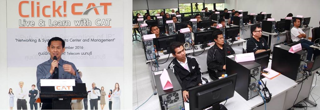 CAT จัดกิจกรรม "Click! CAT" ที่ลูกค้าชื่นชอบอีกครั้ง โดยจับเทรนด์ไอทีที่สำคัญมาจัดการอบรมให้กับผู้บริหารด้านไอทีขององค์กรธุรกิจชั้นนำ ด้วยเล็งเห็นความสำคัญของการเพิ่มศักยภาพความรู้ ให้กับลูกค้าซึ่งเป็นบุคลากรที่ดูแลระบบไอทีองค์กร ให้มีความรู้ความสามารถทันกับกระแสโลกไอที ในหลักสูตร Networking and System in Data Center and Managementเมื่อเดือนพฤศจิกายน ที่ผ่านมา ณ ศูนย์ฝึกอบรม CAT Telecom นนทบุรี