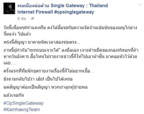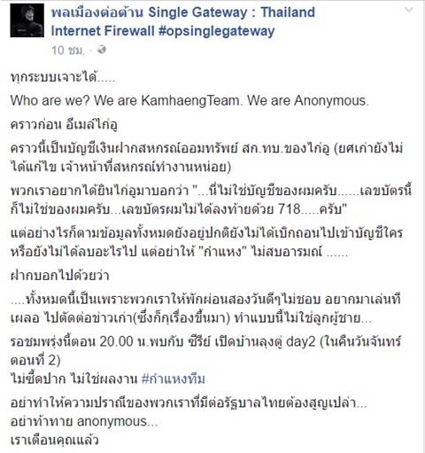 เพจ พลเมืองต่อต้าน Single Gateway เจาะระบบบัญชีธนาคาร พล.ท. สรรเสริญ แก้วกำเนิด - ประกาศกร้าวเตรียมเปิดซีรีส์ บ้านลุงตู่ day 2 26 ธันวาคมนี้ วันที่ 25 ธันวาคม 2559 มีรายงานว่า เพจเฟซบุ๊ก พลเมืองต่อต้าน Single Gateway : Thailand Internet Firewall #opsinglegateway ได้มีการโพสต์ข้อความแฉข้อมูล หลังสามารถเจาะระบบบัญชีธนาคารของ พล.ท. สรรเสริญ แก้วกำเนิด โฆษกประจำสำนักนายกรัฐมนตรี
