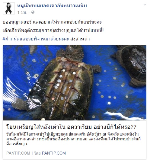 โดยล่าสุด (2 ธันวาคม 2559) เฟซบุ๊กเพจดัง หนูน้อยบนยอดเขาอันหนาวเหน็บ ก็ได้มีการแชร์กระทู้ดังกล่าว พร้อมข้อความว่า "ขออนุญาตแชร์ และอยากให้ทุกคนช่วยกันแชร์นะคะ เลิกเสียทีพฤติกรรม(อยาก)สร้างบุญแต่ได้บาปแบบนี้ ! #ฝากผู้ดูแลช่วยพิจารณาด้วยนะคะ สงสารเต่า"