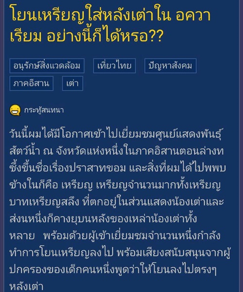 เป็นภาพที่เห็นแล้วชวนให้สลดใจไม่น้อย เมื่อคุณ สมาชิกหมายเลข 1803710 สมาชิกเว็บไซต์พันทิปดอทคอม ได้โพสต์บอกเล่าเรื่องราวในกระทู้ "โยนเหรียญใส่หลังเต่าใน อควาเรียม อย่างนี้ก็ได้หรอ ??" ซึ่งเป็นภาพเต่าในบ่อ ณ ศูนย์แสดงพันธุ์สัตว์น้ำ ที่จังหวัดแห่งหนึ่งในภาพอีสานตอนล่าง และมีเหรียญจำนวนมากคาอยู่ที่กระดอง อีกทั้งยังมีเหรียญตกอยู่ในบ่อ พร้อมด้วยผู้เข้าชมจำนวนหนึ่งที่กำลังโยนเหรียญลงไป ท่ามกลางเสียงสนับสนุนจากผู้ปกครองเด็กคนหนึ่งว่า ให้โยนลงไปตรงหลังเต่า ซึ่งมีความเชื่อว่า การโยนเหรียญลงหลังเต่านั้น จะเป็นการทำบุญ และจะนำโชคลาภมาให้