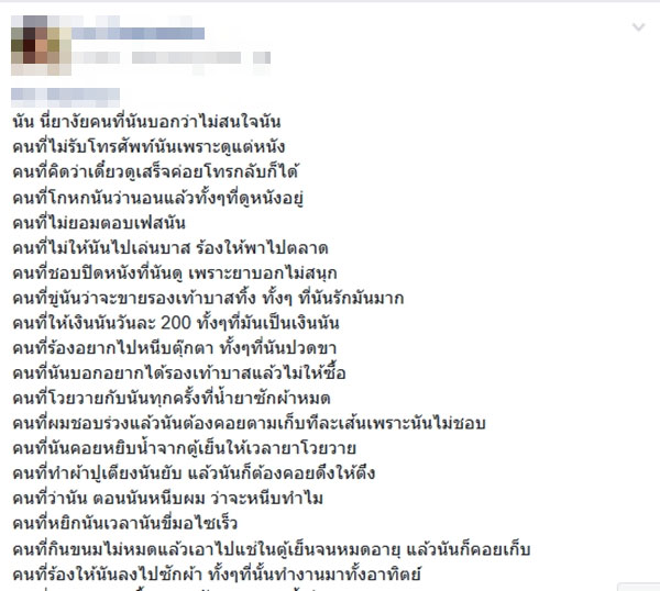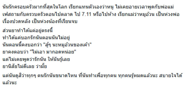 "นันรักครอบครัวมากที่สุดในโลก เรียกแทนตัวเองว่าหนู ไม่เคยอายเวลาพูดกับพ่อแม่ เฟซบุ๊กถามกับครอบครัวตอนไปตลาด ไป 7.11 หรือไปห้าง เรียกแม่ว่าหมูอ้วน เป็นห่วงพ่อเรื่องปวดหลัง เป็นห่วงน้องที่เรียนจบ "