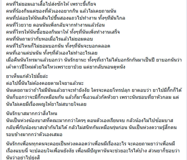 "แต่นันดูสิว่าทุก ๆ คนรักนันขนาดไหน ที่นันทำเพื่อทุกคน ทุกคนรู้หมดแล้วนะ สบายใจได้แล้วนะ"