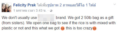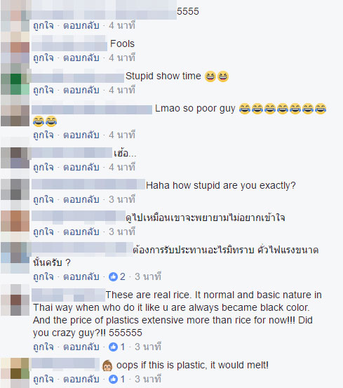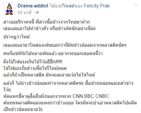 อย่างไรก็ตาม ทางเฟซบุ๊ก Drama-Addict ได้มีการโพสต์ถึงประเด็นดังกล่าวว่า สาเหตุที่ข้าวไหม้ เป็นเพราะใช้ไฟแรงไป ถ้าหากเป็นพลาสติกจริง จะเป็นการละลาย ไม่ใช่ไหม้ และข่าวข้าวปลอมจากพลาสติก เป็นข่าวเต้า