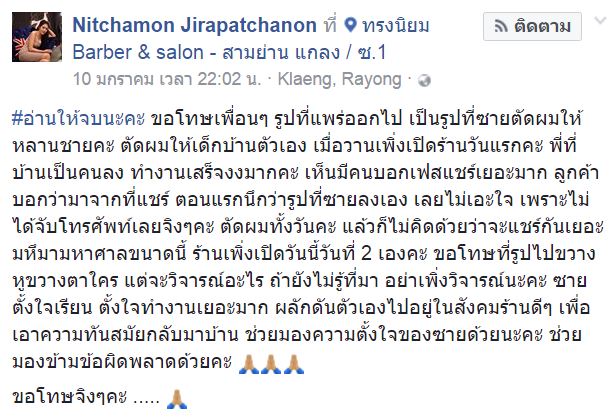 ส่วนกระแสที่บอกว่าเธอโชว์หน้าอกตัดผมนั้น น้องทราย บอกว่า ทำหน้าอกมา 4-5 ปีแล้ว ไม่ได้จะมาโชว์นมเพื่อตัดผม แต่รูปที่ออกไปคือเธอตัดผมให้หลานชาย พี่ที่บ้านเป็นคนลง พอมีคนมาบอกว่าในเฟซบุ๊กแชร์รูปตนกันเยอะมากก็ตกใจ แล้วก็ไม่คิดด้วยว่าจะแชร์กันมหึมามหาศาลขนาดนี้ และที่สำคัญตนตั้งใจเรียน ตั้งใจทำงาน ผลักดันตัวเองไปอยู่ในสังคมร้านดี ๆ เพื่อเอาความทันสมัยกลับมาบ้าน