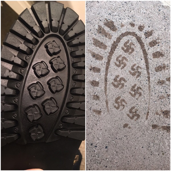 รองเท้าบูทคู่หนึ่งกลายประเด็นร้อนในโซเชียล หลังเจ้าของของมันพบว่าด้านใต้พื้นรองเท้ามีเครื่องหมายสวัสติกะติดอยู่ จากการรายงานของสำนักข่าวบีบีซี เมื่อวันที่ 13 มกราคม 2560 เผยว่า ลูกค้าหนุ่มรายนี้ได้ตั้งกระทู้ลงบนเว็บเรดดิท พร้อมโพสต์รูปภาพพื้นหิมะที่ปรากฏรอยเท้าจากรองเท้าคู้นี้ประทับอยู่ จากในรูปจะสามารถเห็นเครื่องหมายสวัสติกะได้อย่างชัดเจน