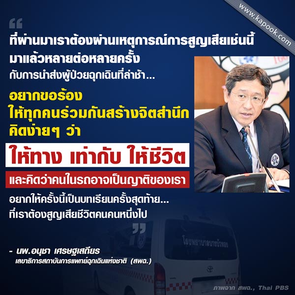 สถาบันการแพทย์ฉุกเฉินแห่งชาติ เผยสถิติผู้ป่วยฉุกเฉินวิกฤตเสียชีวิตถึง 20 เปอร์เซ็นต์ หลังผู้ใช้ถนนไม่ค่อยให้ทาง และปัญหาการจราจรติดขัด