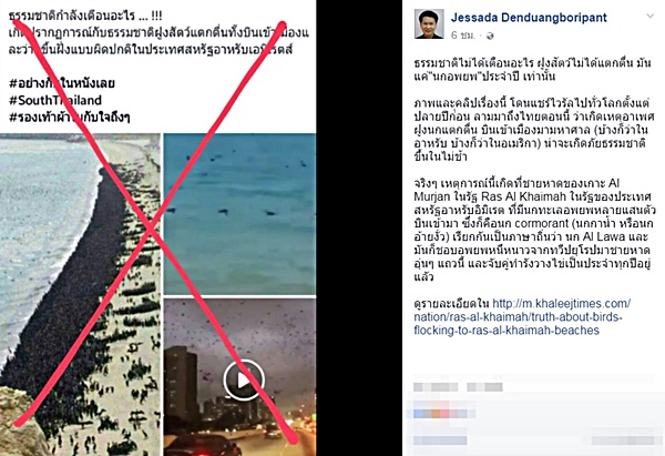 วันที่ 30 มกราคม 2560 มีรายงานว่า อ.เจษฎา เด่นดวงบริพันธ์ อาจารย์ภาควิชาชีววิทยา คณะวิทยาศาสตร์ จุฬาลงกรณ์มหาวิทยาลัย ได้มีการโพสต์ข้อความชี้แจงผ่านทางเฟซบุ๊ก Jessada Denduangboripant เกี่ยวกับเรื่องที่โลกออนไลน์มีการแชร์ภาพเหล่าฝูงสัตว์หลายชนิดแตกตื่น เปลี่ยนที่อยู่ถิ่นฐาน พร้อมข้อความเตือนเหตุอาเพศ โดยยืนยันว่าไม่เป็นความจริง ภาพดังกล่าวเป็นเพียงการอพยพเปลี่ยนที่อยู่เพื่อหนีอากาศหนาวเย็นของฝูงนกเท่านั้น ซึ่งก็เป็นเหตุการณ์ที่เกิดขึ้นประจำในทุก ๆ ปี