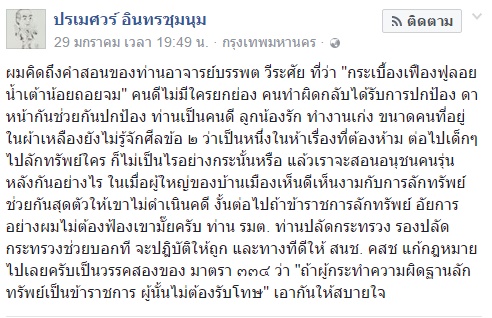เกี่ยวกับเรื่องนี้วันที่ 30 มกราคม 2560 นายปรเมศวร์ อินทรชุมนุม รองอธิบดีอัยการ สำนักงานชี้ขาดอัยการสูงสุด ได้โพสต์ข้อความผ่านเฟซบุ๊กส่วนตัว ปรเมศวร์ อินทรชุมนุม ระบุว่า ตนนึกถึงคำสอนของอาจารย์บรรพต วีระศัย ที่ว่า "กระเบื้องเฟืองฟูลอย น้ำเต้าน้อยถอยจม" ที่สังคมทุกวันนี้คนที่ทำความดี ไม่ได้รับการยกย่อง แต่คนที่ทำผิดกลับได้รับการปกป้อง แถมยังมีการให้เหตุผลว่า ท่านเป็นคนดี ลูกน้องรัก ทำงานเก่ง แล้วต่อไปเด็ก ๆ จะไปลักทรัพย์ใครก็ไม่เป็นอะไรอย่างนั้นหรือ แล้วเราจะสอนคนรุ่นหลังอย่างไร เมื่อผู้ใหญ่ในบ้านเมืองเห็นดีเห็นงามกับการลักทรัพย์ ช่วยกันสุดตัวเพื่อไม่ต้องดำเนินคดี
