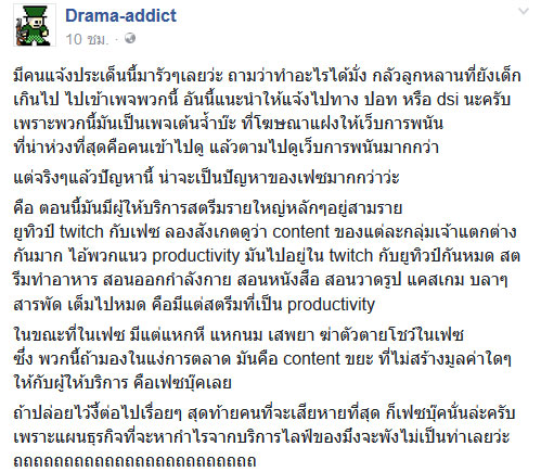 พร้อมกันนี้ทางแอดมินเพจยังระบุว่า ผู้ให้บริการไลฟ์สดใหญ่ ๆ อย่างเช่น เว็บไซต์ยูทูบดอทคอมนั้นมีเนื้อหาจำพวกสตรีมทำอาหาร สอนออกกำลังกาย สอนหนังสือ สอนวาดรูป แคสเกม ฯลฯ ขณะที่เฟซบุ๊กมีแต่ การเต้นเปลือย เสพยา ฆ่าตัวตาย ซึ่งนับว่าเป็นคอนเทนต์ขยะที่ไม่สร้างมูลค่า หากปล่อยไว้เช่นนี้เฟซบุ๊กจะกลายเป็นคนที่เสียหายที่สุด เพราะแผนธุรกิจที่จะหากำไรจากบริการไลฟ์จะมีแต่แย่ลง