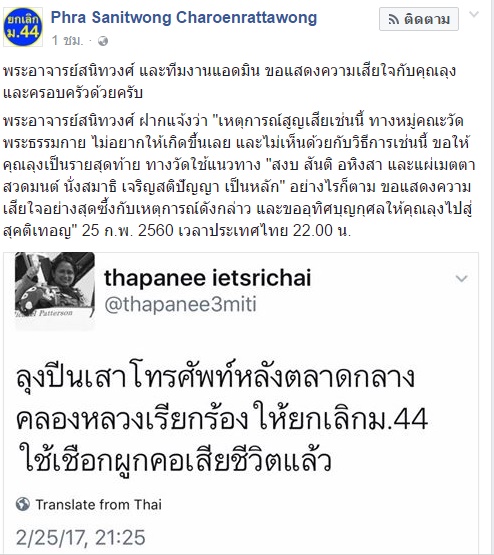เมื่อวันที่ 25 กุมภาพันธ์ 2560 เฟซบุ๊ก Phra Sanitwong Charoenrattawong ของพระสนิทวงศ์ วุฑฒิวังโส ผอ.สำนักสื่อสารองค์กร วัดพระธรรมกาย ได้มีการโพสต์แสดงความเสียใจ หลังจากที่คุณลุงรายหนึ่งได้ผูกคอตาย ประท้วงรัฐยกเลิก มาตรา 44 คุมวัดพระธรรมกาย จ.ปทุมธานี (อ่านข่าว ชายปีนเสาโทรศัพท์ ประท้วงหยุดใช้ ม.44 ตัดสินใจผูกคอตายเสียชีวิตแล้ว) มีข้อความทั้งหมด ดังนี้