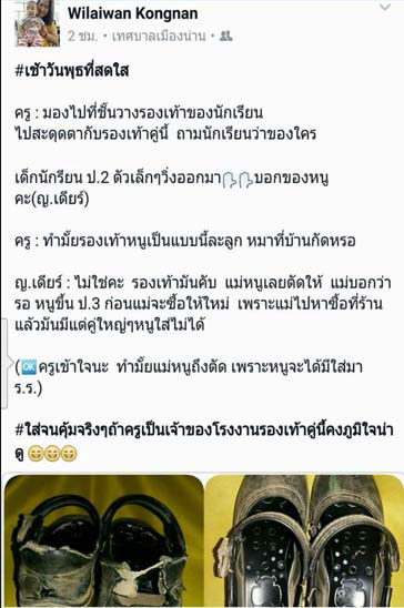 ครูสาวโพสต์ภาพรองเท้านักเรียนขาด พร้อมบทสนทนาชวนยิ้มระหว่างครู กับลูกศิษย์ตัวน้อย ถึงสาเหตุที่ว่า...ทำไมถึงสวมรองเท้าขาด วันที่ 9 มีนาคม 2560 โลกออนไลน์แห่แชร์บทสนทนาและภาพจากผู้ใช้เฟซบุ๊กชื่อ Wilaiwan Kongnan ที่ได้บอกเล่าเรื่องราวของ "น้องเดียร์" ด.ญ.ปิยะมาศ คำลี อายุ 7 ขวบ เด็กนักเรียนชั้น ป.2 ที่สวมรองเท้านักเรียนขาดมาโรงเรียน จนทำให้มีผู้คนในโซเชียลเห็นใจและอยากจะซื้อรองเท้าคู่ใหม่ให้แก่หนูน้อย โดยข้อความที่เกี่ยวกับสาเหตุของรองเท้าขาด อันเป็นสิ่งที่สร้างรอยยิ้มจากผู้อ่านจำนวนมาก มีดังต่อไปนี้