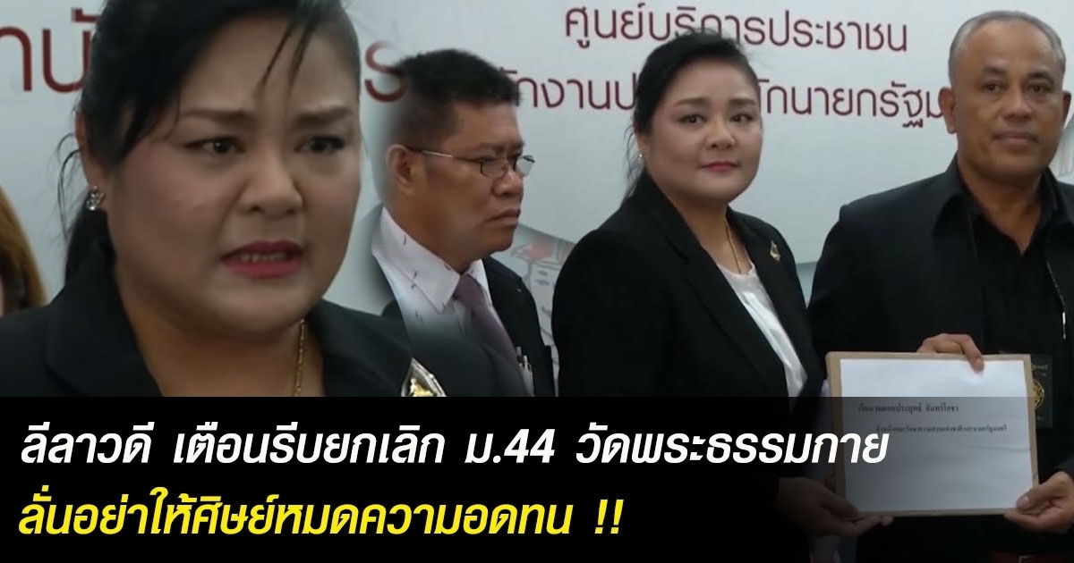 น.ส.ลีลาวดี อดีต ส.ส.พรรคเพื่อไทย ยื่นหนังสือถึง พล.อ. ประยุทธ์ ให้ยกเลิก มาตรา 44 กับวัดพระธรรมกาย ชี้ใช้อำนาจเกินขอบเขต เตือนอย่าให้ศิษย์หมดความอดทน