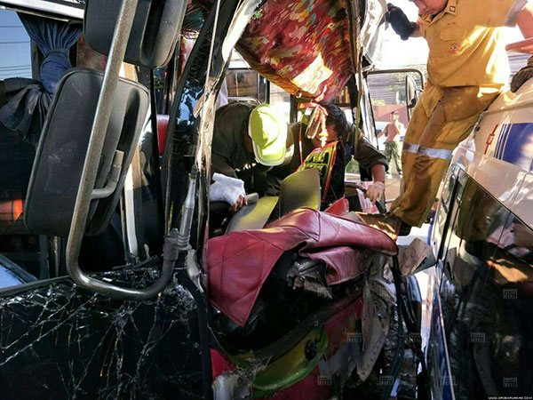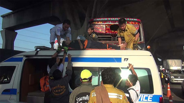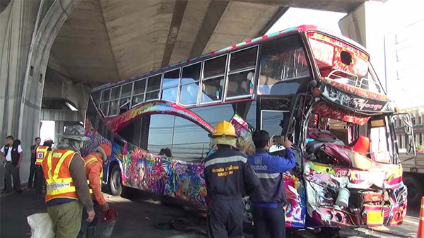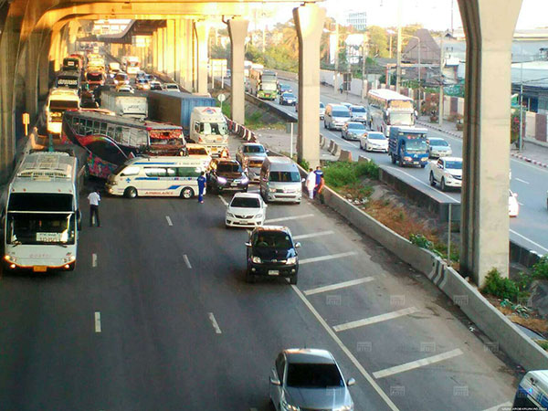 รถบัสรับ-ส่งพนักงานบริษัทเบรกไม่อยู่ชนท้ายรถสิบล้อ ก่อนพุ่งชนรถตู้ฉุกเฉิน ที่ถนนบางนา-ตราด มีผู้ได้รับเจ็บ 18 ราย