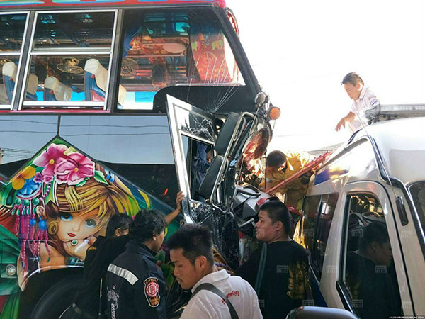 จากการสอบสวน นายสุรสิทธิ์ แจ่มจำรัส อายุ 64 ปี คนขับรถบัส เผยว่า ตนขับรถบัสคันดังกล่าวมุ่งหน้าไปส่งพนักงานในโรงงานแห่งหนึ่งย่านบางเสาธง เมื่อมาถึงจุดเกิดเหตุซึ่งเป็นช่วงการจราจรคับคั่ง ตนได้พยายามเหยียบเบรกเพราะรถสิบล้อด้านหน้าได้หยุดรถกะทันหัน แต่เบรกไม่อยู่จึงชนท้าย ก่อนจะเสียหลักไปชนกับรถตู้มูลนิธิฯ อีก 1 คัน ซึ่งตนเองก็ได้รับบาดเจ็บเนื่องจากถูกคอนโซลนรถบัสกดทับ ต้องใช้เครื่องมือตัดถ่างงัดซากรถเพื่อนำร่างตนออกมา