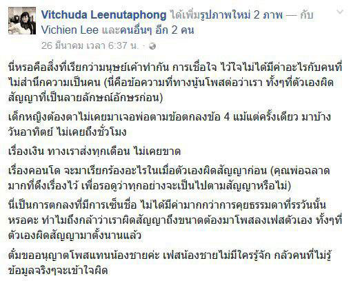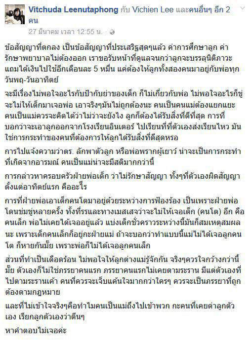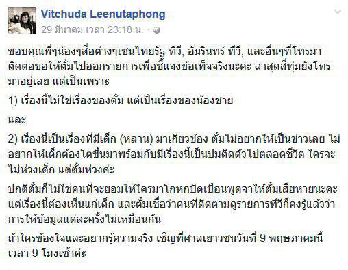 นอกจากนี้ จากการตรวจสอบไปที่ เฟซบุ๊ก Vitchuda Leenutaphong ของไฮโซตั๋ม พบว่า มีการโพสต์ข้อความพร้อมกับหนังสือการทำสัญญาข้อตกลงเรื่องการดูแลลูกของน้องชายของเธอกับอดีตภรรยา โดยโพสต์ตั้งแต่วันที่ 26 มีนาคม 2560 และมีการโพสต์ถึงเรื่องนี้เป็นระยะ ข้อความส่วนหนึ่งระบุว่า... ทางครอบครัวของเธอจ่ายค่าการศึกษาลูก ค่ารักษาพยาบาลทุกอย่างจนกว่าเด็กบรรลุนิติภาวะ และยังให้เงินค่าเลี้ยงดูอีกเดือนละ 5 หมื่นบาท ถ้ามีเรื่องไม่พอใจอะไรกับป้า กับย่าของเด็ก คนเป็นแม่ก็ควรจะแยกแยะและเลือกสิ่งที่ดีที่สุดให้ลูก ส่วนที่ทำเป็นเดือดร้อน ไม่พอใจให้ลูกต่างแม่รู้จักกัน จริง ๆ ควรใจกว้างกว่านี้ไหม เพราะตัวเองก็ไม่ใช่ภรรยาคนแรก