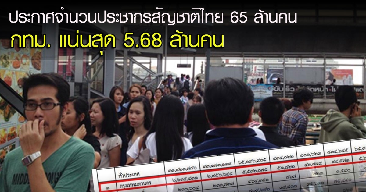 โดยพบว่าจำนวนประชากรทั่วประเทศเฉพาะที่มีสัญชาติไทยมีจำนวน 65,096,905 คน แบ่งเป็นหญิง 33,173,119 คน ชาย 31,923,786 คน ประชากรหญิงมากกว่าชาย 1,249,333 คน