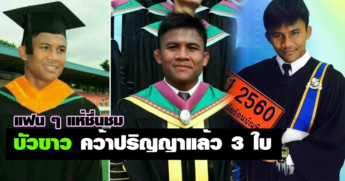 แห่ชื่นชม บัวขาว บัญชาเมฆ นักมวยชื่อดังไม่เคยทิ้งการเรียน ล่าสุดเพิ่งจบปริญญาตรีบริหารธุรกิจ หมาด ๆ คว้าปริญญาถึง 3 ใบจากอายุแค่ 34 ปี วันที่ 2 เมษายน 2560 โลกออนไลน์แห่ชื่นชมความสำเร็จของ บัวขาว บัญชาเมฆ นักมวยชื่อดังขวัญใจชาวไทย วัย 34 ปี ที่ตอนนี้บัวขาวสำเร็จการศึกษาปริญญาบริหารธุรกิจบัณฑิต : บธ.บ. คณะบริหารธุรกิจ สาขาการจัดการ มหาวิทยาลัยรัตนบัณฑิต ซึ่งถือเป็นปริญญาใบที่ 3 ของนักชกเจ้าของฉายา "ดำดอทคอม" อีกด้วย