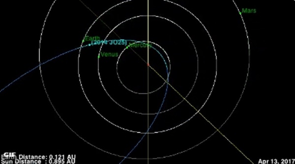 ดาวเคราะห์น้อย 2014 JO25 ขนาดเส้นผ่านศูนย์กลาง 1.4 กิโลเมตร จะเคลื่อนตัวเข้าใกล้โลกมากที่สุดในรอบไม่ต่ำกว่า 400 ปี ในวันที่ 19 เมษายน 2560