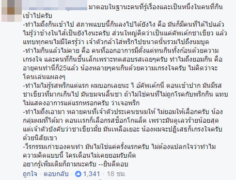 - ทำไมกินแล้วไม่คาย คือ คนที่ออกอาการมีตั้งแต่ทนกินทั้งก้อนด้วยความเกรงใจ และคนที่กินชิ้นเล็กเพราะทดสอบรสเฉย ๆ ครับ ทำไมถึงยอมกิน คืออายุคนทำนี่ก็ 25 แล้ว น้องหลาย ๆ คนกินด้วยความเกรงใจครับ ไม่คิดว่าจะโดนเล่นแผลง ๆ