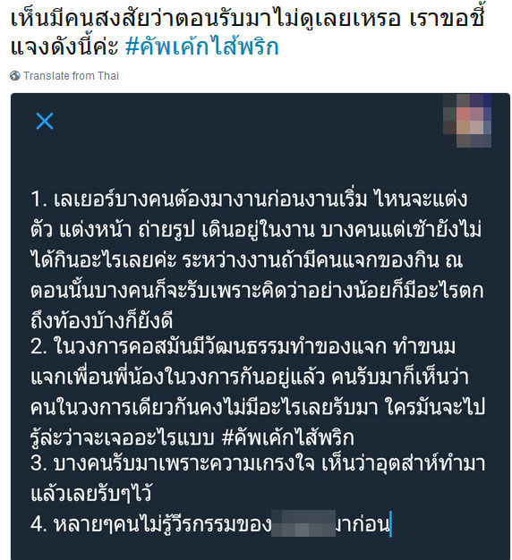 โดยในกรณีนี้ ได้มีผู้ที่อยู่ในงานคอสเพลย์ดังกล่าว และผู้เสียหาย โพสต์ชี้แจงตอบข้อสงสัยของโซเชียลเน็ตเวิร์กว่า เป็นวัฒนธรรมของชาวคอสเพลย์ ทุกคนเป็นพี่น้อง ขณะที่บางคนก็หิว เนื่องจากใช้เวลาแต่งตัว แต่งหน้าก่อนงานเริ่ม จึงไม่ได้กินอะไร พอมีคัพเค้กเข้ามาก็ถือว่าสามารถรองท้องได้บ้าง