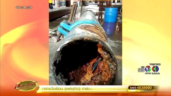 ทั้งนี้ ท่อที่ปรากฏในภาพเป็นท่อเหล็กอาบสังกะสี หรือเรียกว่า ท่อ GI ขนาดเส้นผ่านศูนย์กลาง 5 นิ้ว ปัจจุบันการประปาได้เลิกใช้ไปแล้ว แต่ยังคงมีเหลืออยู่ในบางพื้นที่ที่มีปัญหายังไม่สามารถเปลี่ยนท่อได้ เช่น เจ้าของพื้นที่ไม่ยอมให้ขุด หรือไม่มีพื้นที่ให้วางท่อ ซึ่งเหลือไม่ถึง 1% ของท่อทั้งหมดของการประปา ส่วนสิ่งที่เกาะอยู่ภายในท่อสีที่มีเหลือง เรียกว่า ตะกรัน ซึ่งท่อ GI นี้ โดยปกติเมื่อใช้ไปนาน ๆ อนุภาคเล็ก ๆ ที่อยู่ในน้ำแต่มองด้วยตาเปล่าไม่เห็นจะจับกับตัวท่อจนเกิดเป็นตะกรันหนาขึ้น และมีลักษณะแข็ง เป็นเหตุให้ท่ออุดตัน น้ำไหลอ่อนลง หรือเกิดท่อแตกรั่วได้ง่าย หากเจอแรงดันน้ำสูง ๆ