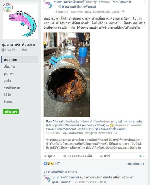 เมื่อวันที่ 1 พฤษภาคม 2560 มีรายงานว่า โลกออนไลน์ได้แชร์ภาพจากผู้ใช้เฟซบุ๊กรายหนึ่ง ที่โพสต์ภาพท่อประปา ขนาดใหญ่เต็มไปด้วยสนิมเกรอะกรัง และตะกอน ในบริเวณพื้นที่ ชุมชนหลวงพรต ท่านเลี่ยม เขตลาดกระบัง โดยมีคำถามว่าต้องทนใช้แบบนี้ไปอีกนานแค่ไหน มีทีมสำรวจมาสำรวจมาเป็นปีแล้วยังไม่มีการดำเนินการใด ๆ ซึ่งเรื่องนี้ทำเอาโซเชียลวิพากษ์วิจารณ์กันอย่างหนาหู