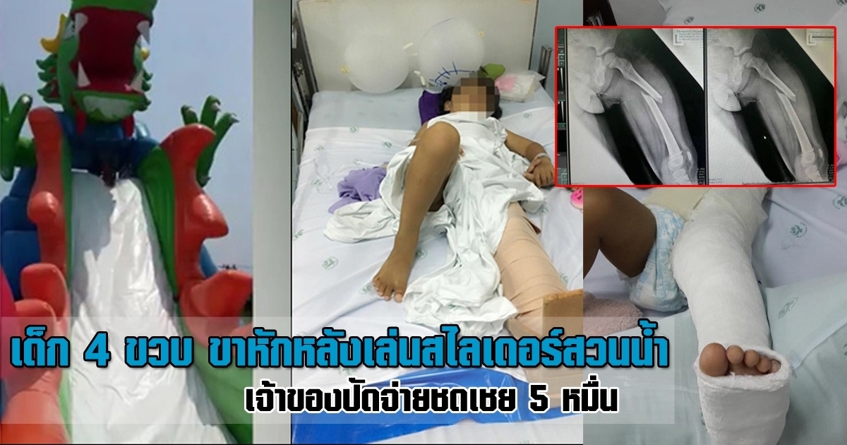 เด็ก 4 ขวบ เล่นสไลเดอร์ที่สวนน้ำจนขาหัก เจ้าของปัดจ่ายเงินชดเชย 5 หมื่น เพราะเด็กแค่ขาหัก จ่ายแค่เพียงค่ารักษาพยาบาล 1 หมื่นเท่านั้น พร้อมท้าฟ้องร้องหากไม่พอใจ