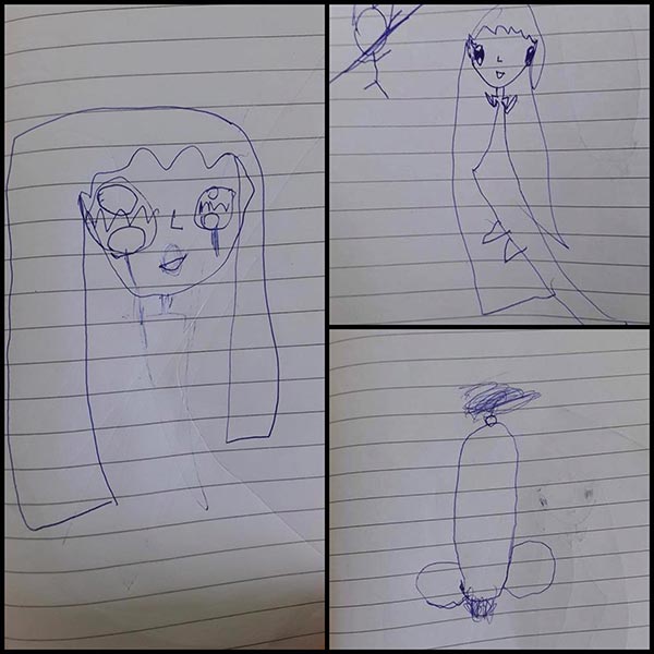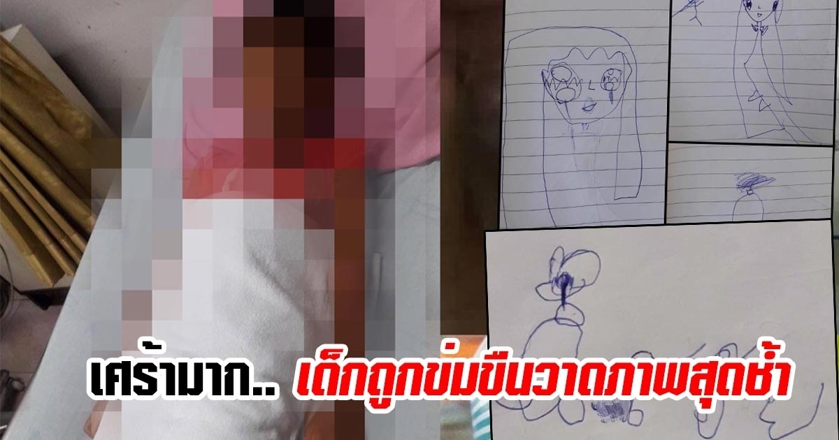 นอกจากนี้ทางเพจยังได้เผยภาพวาดสุดเศร้าที่สะท้อนว่า เด็กหญิงวัย 7 ขวบคนนี้บอบช้ำมากขนาดไหน กับสิ่งที่เธอต้องพบเจอมา เพราะน้องวาดวนไปวนมาแบบนี้ซ้ำ ๆ ...