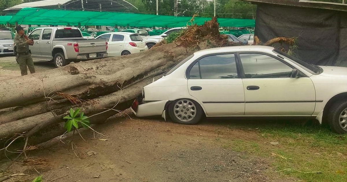 เตือนภัยหน้าฝน เผยคลิปรถเก๋งจอดรถข้างต้นไม้ใหญ่ แต่เจอลมพัดแรง ทำล้มหล่นทับท้ายรถเต็ม ๆ โชคดีไม่มีผู้บาดเจ็บ วันที่ 16 พฤษภาคม 2560 โลกออนไลน์ แชร์คลิปของผู้ใช้เฟซบุ๊ก Kongrit Sanguansin ที่โพสต์คลิปเตือนภัยในหน้าฝน อย่าจอดรถไว้ใกล้ต้นไม้ใหญ่ ไม่เช่นนั้นอาจเกิดอุบัติเหตุที่ไม่คาดฝันได้