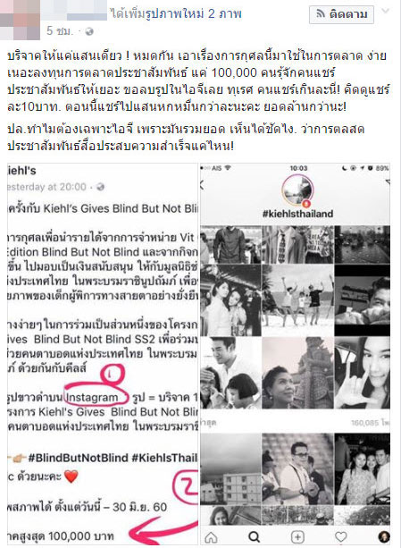 กลายเป็นประเด็นร้อนที่สังคมกำลังถกเถียง กรณี คีลส์ แบรนด์เครื่องสำอางชั้นนำ ได้จัดโครงการ kiehl's gives blind but not blind ss2 ซึ่งให้ผู้ที่สนใจโพสต์รูปขาว-ดำพร้อมติดแฮชแท็กที่กำหนด เท่ากับช่วยบริจาค 10 บาท ให้กับมูลนิธิช่วยคนตาบอดแห่งประเทศไทย ทำให้มีคนสนใจทำตามมากมายรวมไปถึงคนที่มีชื่อเสียงในวงการบันเทิงนั้น