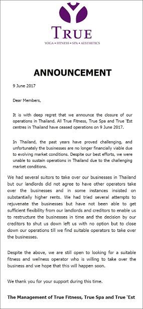 โดยทางบริษัทยังคงมองหาผู้ประกอบการด้านฟิตเนสและสุขภาพที่เหมาะสม และประสงค์จะเข้ามาดูแลกิจการของเราต่อไป และหวังว่ามันจะเกิดขึ้นในเร็ว ๆ นี้ พร้อมทั้งขอขอบคุณสำหรับการสนับสนุนของทุกท่าน จากผู้บริหาร True Fitness, True Spa และ True 'Est